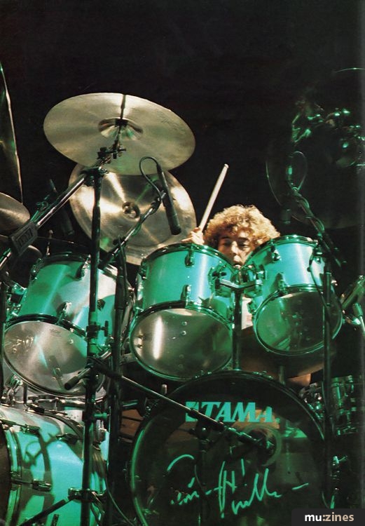"They then took us out to a wonderful meal and really looked after us, as they do, of course. At that next gig they brought their gear along, I had a look at it and it was really beautifully made. But I was interested in fibreglass only so they said 'Ah, yes, Tokyo'. So I get to the Budokan for a sound-check and there's this great Tama fibreglass kit that they'd brought along, all set-up and looking really lovely. They wanted me to use it that night but I couldn't, not a strange kit. So I explained to them why I couldn't use it there and then and told them about some special sizes that I'd like to try. That was it. In about 78 or 79 a white Tama kit came along and I've used it ever since, it's been round the World any number of times!