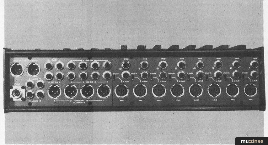 Group and master stereo outputs are by XLR male sockets whilst jack connections for the four Auxiliary outputs and 2-track tape return complete the rear panel. However, no mention has yet been made of the monitor outputs that are usually provided to feed the control room speakers. The reason for this is because there aren't any! You have to either do without; feed them from the main stereo mix outputs (which means you can't do a rough stereo mix unless you use split leads to feed both speakers and tape machine inputs), or take an output from the headphone socket (the most likely one).