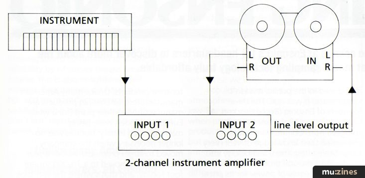 In this system I used a twin channel guitar amplifier which had a line-level output as well as its standard speaker output. The advantage of a reel-to-reel tape recorder is that it can (usually) record on one track at a time rather than necessarily both together, as with cassette machines. This means that you only need one recorder.
