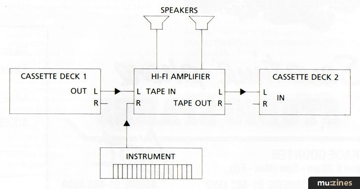 The first step is to record a basic track on one machine. It could be a drum machine track or a simple bass line. Next, you replay this track into the second machine while adding another musical line on top of it. If you keep 'bouncing' the recording back and forth between the two machines, you can soon build up the basics of a song. You lose a little quality on each bounce, but five or six overdubs should be possible while still achieving an acceptable result. It sounds too simple to be true, but I can assure you that it does work and I shall tell you later about my own experiences with the technique. Time for a diagram...