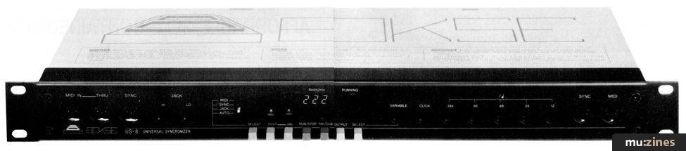 By connecting an instrument such as a drum machine (running at the manufacturer's preset clock rate of 48 pulses per quarter note, for example) to the relevant input socket on the US-8, the timing data it sends out is converted automatically by the Syncronizer to whatever format you select from the options available as outputs. All you need do is choose whatever output suits the device you wish to have controlled by the drum machine, connect it to the US-8 and you're in business. It really is as simple as that to operate.