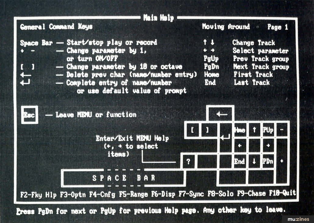 In addition, there is an enormous 90K's worth of help screens on the system disk, which you can call up by pressing a function key. They give you even more information about the current menu, and once you are familiar with the operation of the sequencer you'll find the help screens a ready substitute for the manual. And if you think you'll soon get to the point where you no longer need on-screen prompts, you can dispense with them altogether leaving more room to display music information.