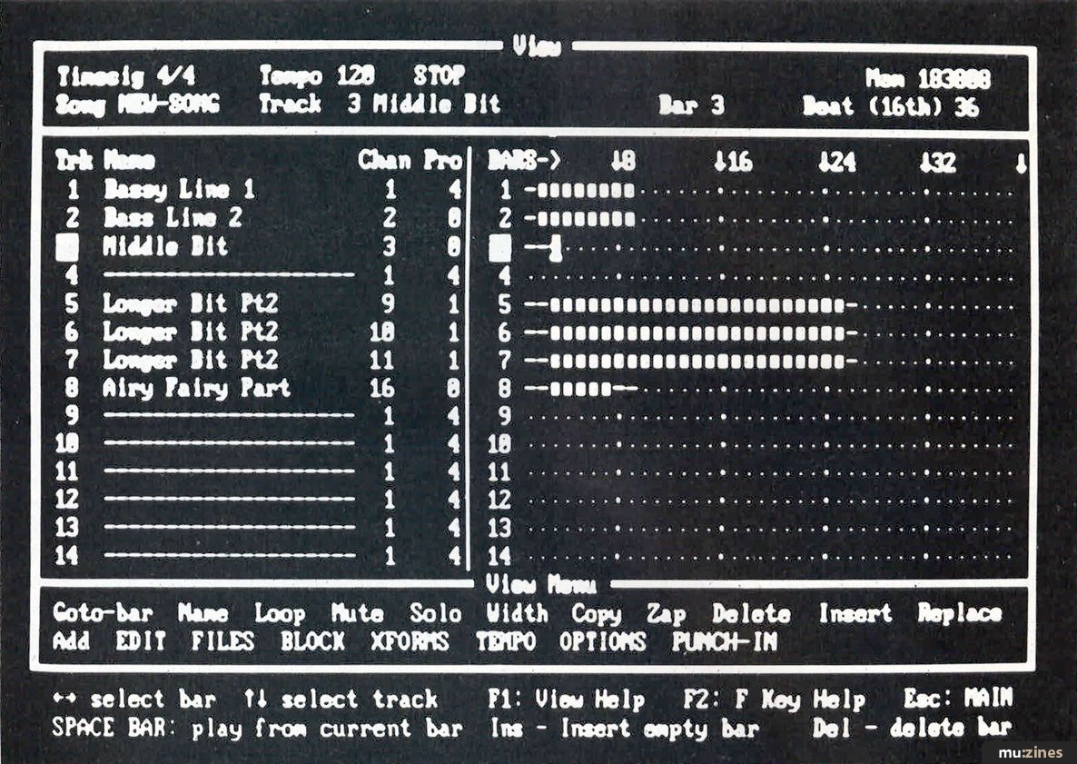 These four screens are at the heart of the program's editing facilities. In the View screen you can Copy, Delete, Move, Insert and Add bars. The program has six buffers and gives cut-and-paste a new meaning.
