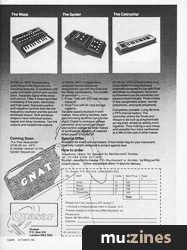 The Wasp has two voltage controlled oscillators. To the best of my knowledge no other synthesiser retailing at twice the Wasp's price has two VCOs. Oscillator 1 has a five-position footage switch, a square, sawtooth, and 'off' waveform selector, and a pulse width control for varying the square wave's shape; oscillator 2 has the same footage and waveform selectors, and also a pitch control for tuning up to oscillator 1. The whole instrument is tuned to standard pitch or to other instruments by a small screwdriver operated preset. The Wasp uses digital circuitry for tuning and is amazingly stable. I understand that patents have been taken on this method of digital tuning and I'm not at all surprised, because you just don't have to worry at all about the instrument drifting out of tune during a gig, not even if the batteries start to run down, a real relief to any synthesiser player, most of whom have enough to worry about anyway. The rotary pitchbend control is a bit disappointing though, bending only around a tone up or down and using a deadband in the centre, no click. However the glide control makes up for this; when operated it delays the glide on one of the oscillators so that both VCOs sweep up (or down) slightly out of tune. This gives a very fat sound, and with a maximum glide time of around three seconds per octave, is a good feature.