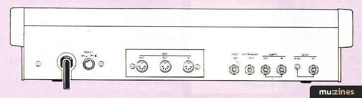 On the back panel are connections for Click In (with level control), SMPTE In, SMPTE Out, Metronome Out, Footswitch, MIDI In and two MIDI Outs. No MIDI Thru in this case. I couldn't think of a use for one here myself, but I'll bet there is someone somewhere...